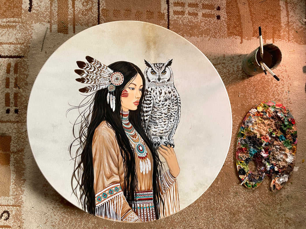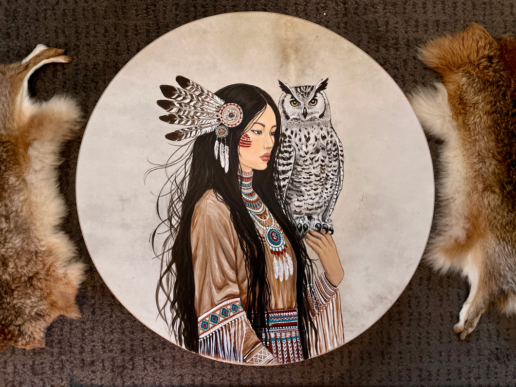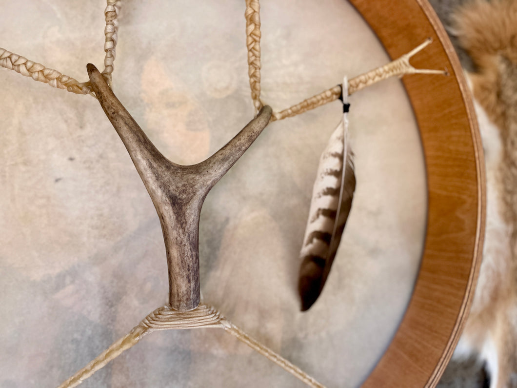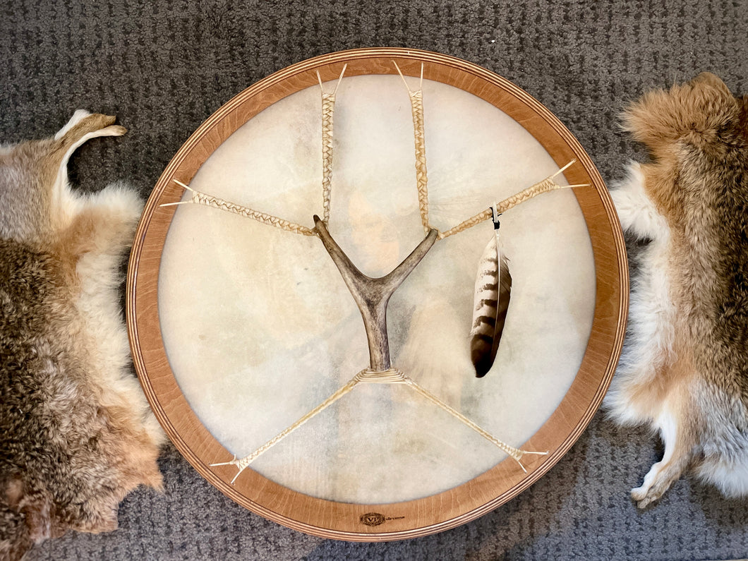 This drum carries the spirit of sacred awareness and inner wisdom. The native woman stands in stillness, turning inward, listening to something deeper within.