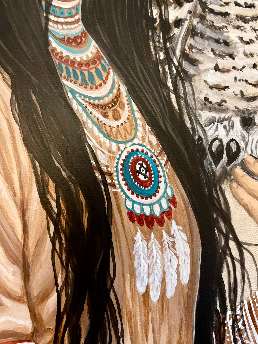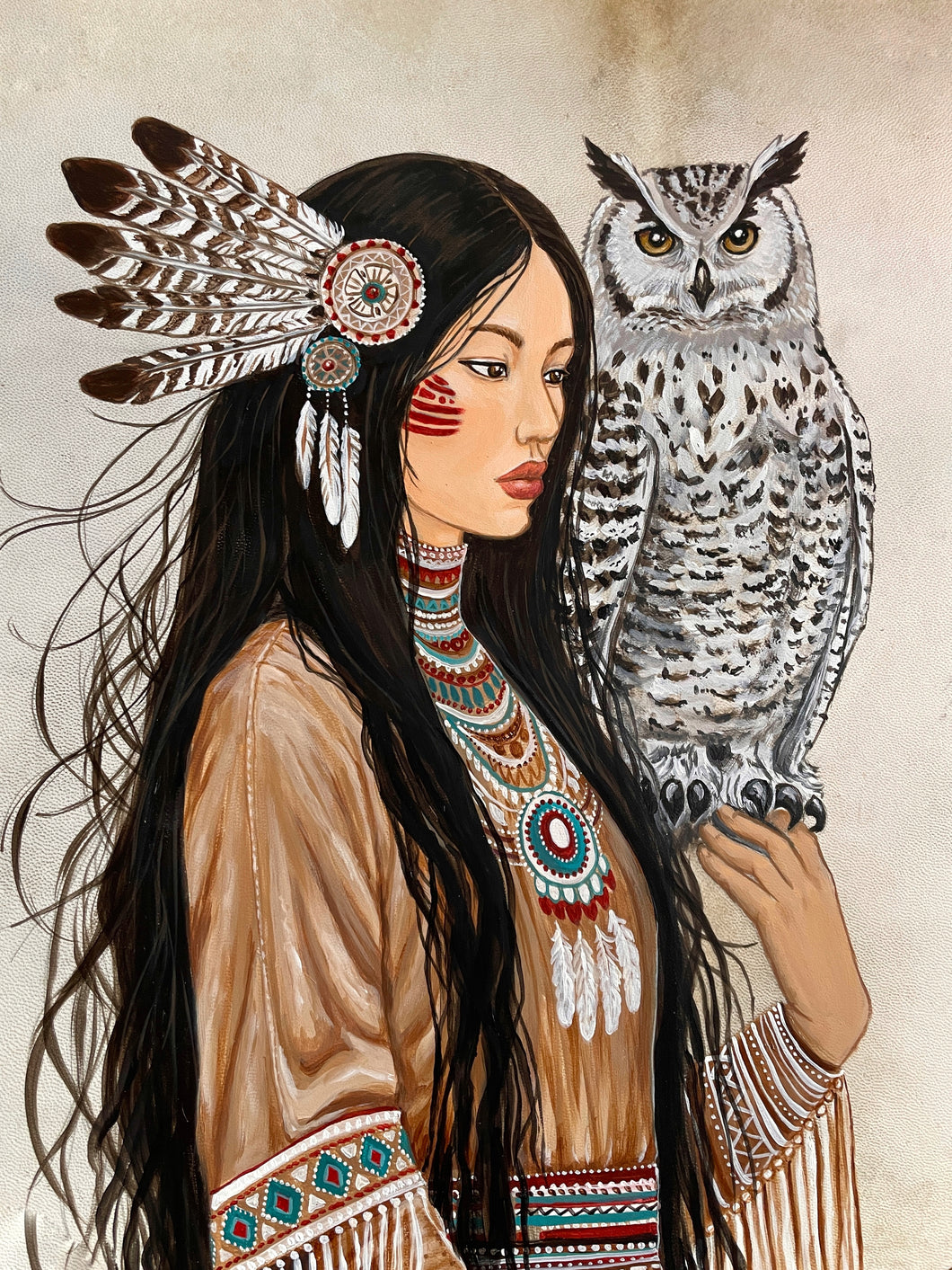 The owl rests beside her as a guardian of the night. It sees what others cannot. It reminds us that wisdom comes in silence, in moments when we trust our instincts more than our eyes. Together, they hold balance-the human heart and the wild spirit walking as one.
