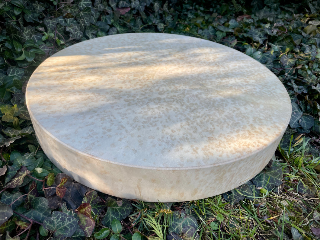 This handcrafted drum is made from a natural spotted wild goat hide— a living record of nature’s design. The 55cm / 22” frame produces a sound that is powerful yet soft, deep and resonant at the same time. Its voice carries both strength and subtlety, ideal for grounding, ceremony, or meditative practice.